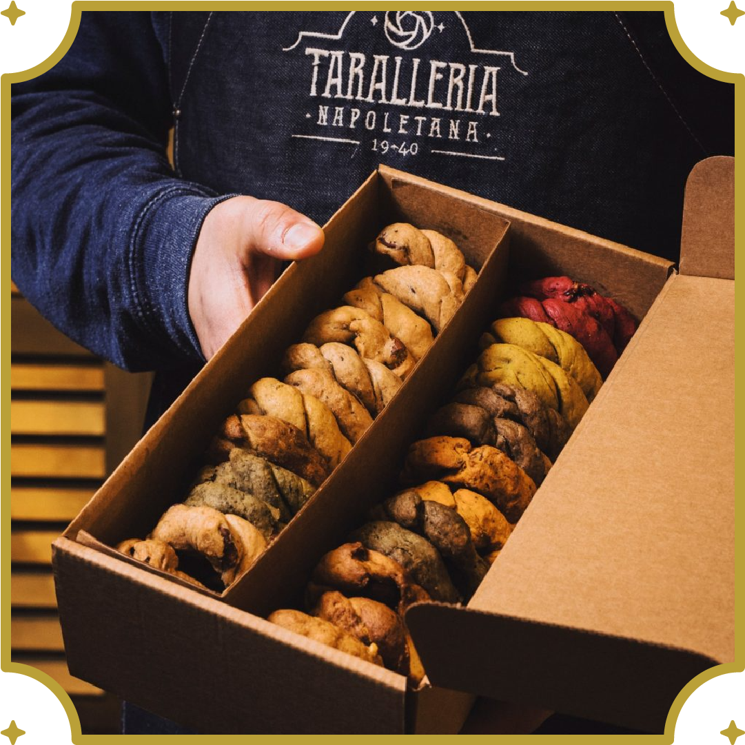 Abbiamo declinato il nostro tarallo in una varietà di gusti e abbinamenti sperimentali e sorprendenti. Dai classici taralli “sugna e pepe” a quelli ai pomodorini del piennolo, ai friarielli, alla genovese fino ad arrivare alle nostre scelte integrali e vegane.